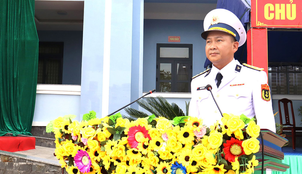 Thượng tá Phạm Văn Sơn phát biểu tại buổi lễ và trao tặng hoa chúc mừng Trung tâm Huấn luyện Vùng 2 Hải quân
