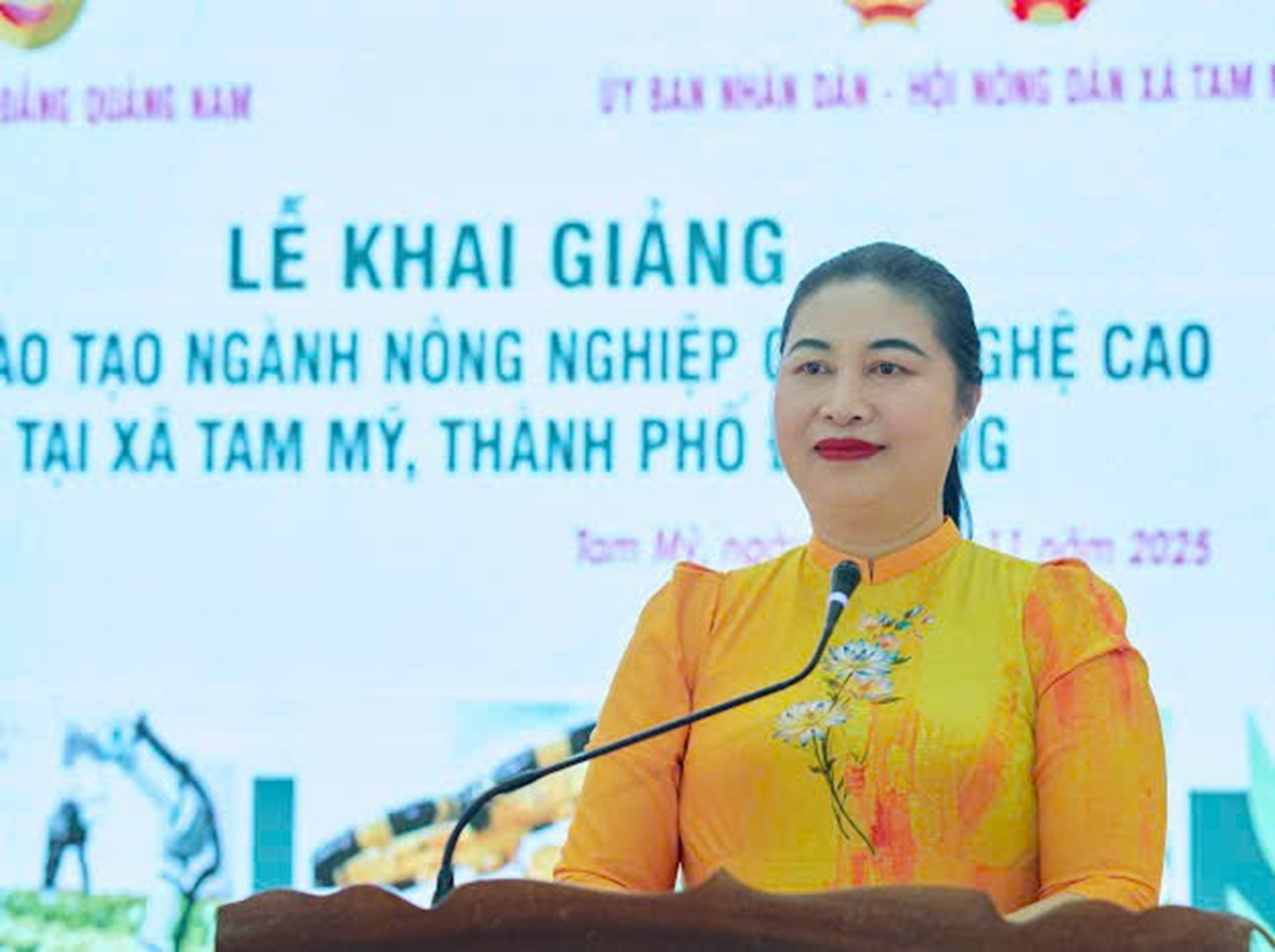 Phát biểu tại Lễ khai giảng, PGS.TS Vũ Thị Phương Anh, Bí thư Đảng ủy - Hiệu trường Cao đẳng Quảng Nam cho biết: “Chương trình đào tạo gồm 54 tín chỉ với 28 môn học – mô đun, trong đó có gần 1.000 giờ thực hành, thực tập, giúp người học không chỉ nắm chắc lý thuyết mà còn rèn luyện kỹ năng nghề nghiệp vững vàng. Nội dung đào tạo bao quát từ công nghệ sản xuất giống, kỹ thuật trồng và chăm sóc cây trồng chủ lực, kỹ thuật chăn nuôi gia súc – gia cầm – thủy sản, đến công nghệ trồng cây trong nhà màng, ứng dụng CNTT và IoT trong sản xuất nông nghiệp, công nghệ sau thu hoạch, khởi nghiệp trong nông nghiệp 4.0, và đặc biệt là các học phần rèn nghề – thực tập tốt nghiệp tại doanh nghiệp nông nghiệp công nghệ cao lớn trong thành phố và khu vực như: Công ty cổ phần Nông nghiệp Trường Hải (THACO AGRI); Tập đoàn Nông nghiệp sinh thái công nghệ cao (Ricco Group); Công ty Cổ phần Nông nghiệp Công nghệ cao (AFARM); Công ty Nông nghiệp CNC (HacoFarm), Viện Nông nghiệp Việt Nam, Các viện, trung tâm nông nghiệp CNC trên địa bàn thành phố Đà Nẵng… Ở lớp học này, các em chính là những nhân tố tiên phong, sẽ trực tiếp mang những kiến thức mới về nông nghiệp hiện đại, ứng dụng vào thực tiễn sản xuất tại gia đình và cộng đồng. Khóa học này không chỉ trang bị cho các em kiến thức về giống cây trồng, kỹ thuật canh tác tiên tiến, hệ thống tưới tiêu tự động, mà còn là tư duy làm nông nghiệp bền vững, hiệu quả trong thời đại mới. Nhà trường cam kết sẽ tạo mọi điều kiện tốt nhất về cơ sở vật chất, đội ngũ giảng viên tận tâm, giàu kinh nghiệm để các em yên tâm học tập và rèn luyện. Chúng tôi tin tưởng rằng, với sự nỗ lực, ham học hỏi của các em cùng sự hỗ trợ tích cực từ chính quyền địa phương và nhà trường, khóa học sẽ đạt được kết quả cao nhất…”.