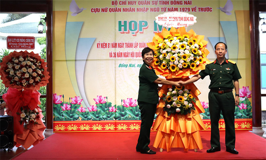 Thượng tá Bùi Khánh Hòa, Phó Chỉ huy trưởng Bộ CHQS tỉnh tặng hoa chúc mừng buổi họp mặt