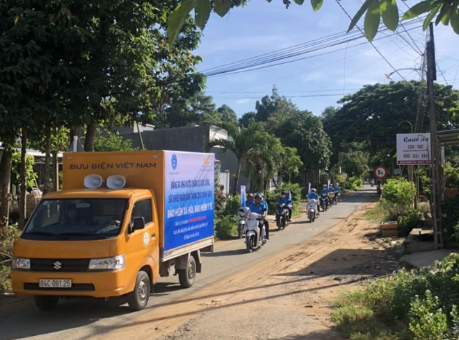 Đoàn diễu hành tuyên truyền tại các xãSau buổi lễ, đoàn diễu hành cùng với loa, cờ tuyên truyền dọc theo tuyến đường quốc lộ và hương lộ, qua địa bàn thị trấn Cầu Ngang và các xã Hiệp Hoà, Nhị Trường, Long Sơn, Thuận Hòa, Mỹ Hòa. Tiếp theo, đoàn tiếp tục chia thành từng nhóm nhỏ đến các hộ gia đình trên địa bàn phát tờ rơi, tuyên truyền trực tiếp chính sách BHXH tự nguyện và BHYT hộ gia đình cho người dân.