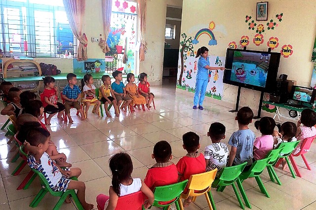 Trường Mầm non Phong Cốc dạy trẻ em kỹ năng phòng chống đuối nướcĐặc biệt, với địa hình có nhiều ao, hồ, sông, ngòi dày đặc, tiềm ẩn nguy cơ rủi ro xảy ra tai nạn đuối nước đối với trẻ em, nên thời gian qua các cấp, các ngành trên địa bàn thị xã luôn chú trọng, quyết liệt triển khai các giải pháp nhằm giảm thiểu tình trạng đuối nước, như: Trang bị bể bơi khung kim loại INTEX; Chỉ đạo 19/19 phường, xã rà soát, cắm biển cảnh báo ở các khu vực nước sâu, nguy hiểm; Xây dựng thí điểm hàng rào lan can tại phường Yên Hải, phường Phong Cốc và xã Liên Hòa với tổng chiều dài 1.550m; Tuyên truyền phòng, chống đuối nước trên loa phát thanh tại các thôn, khu phố; Tổ chức sinh hoạt hè cho thanh thiếu nhi tập trung vào chủ đề phòng, chống TNTT, đặc biệt là tai nạn đuối nước... Hiện nay, trên địa bàn thị xã có 19 bể bơi phục vụ công tác phòng, chống đuối nước cho trẻ em (phấn đấu đến hết năm 2020, 100% phường, xã có mô hình bể bơi phòng, chống tai nạn đuối nước trẻ em). Trong 4 năm qua, có 11.527 lượt trẻ em trong độ tuổi tiểu học và trung học cơ sở được dạy bơi và biết bơi, trong đó có 64 lớp học bơi miễn phí dành cho 1.620 trẻ em thuộc hộ nghèo, cận nghèo, có hoàn cảnh khó khăn từ nguồn ngân sách của tỉnh và thị xã.