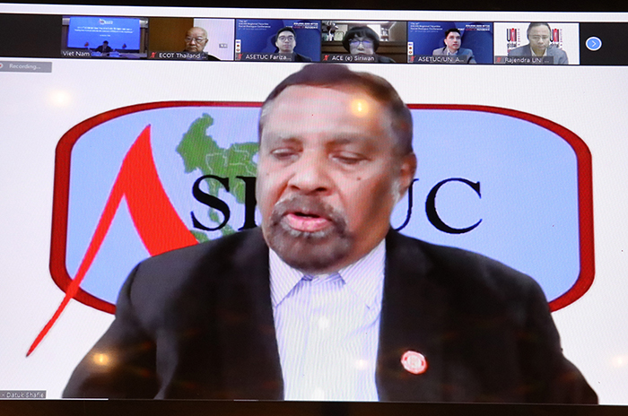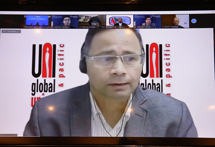 Ông Rajendra Kumar Acharya, Thư ký Văn phòng Khu vực Châu Á - Thái Bình Dương (UNI Apro) chia sẻ trực tuyếnTrong nội dung thứ nhất, đại diện chính phủ In-đô-nê-xia, Hiệp hội của người sử dụng lao động Phi-líp-pin và đại diện Văn phòng khu vực của Tổ chức UNI Apro đã chia sẻ thông tin tổng quan về tác động của đại dịch tới sự ổn định của thị trường lao động, khuynh hướng chính của việc làm, cách thức bố trí công việc mới, chất lượng và điều kiện làm việc và sự mở rộng của an sinh xã hội. Ngoài ra, các đại diện cũng đề xuất những khuyến nghị dành cho các đối tác ba bên nhằm góp phần vượt qua những thách thức mới nổi trong việc đảm bảo việc làm thỏa đáng cho tất cả mọi người. Các đại diện đều đồng quan điểm cho rằng người lao động phi chính thức và người lao động di cư là những đối tượng chịu ảnh hưởng mạnh nhất của đại dịch vì họ không nằm trong các thương lượng tập thể chính thức cũng như không nhận được sự đảm bảo đầy đủ về an sinh xã hội tại các nước thành viên.