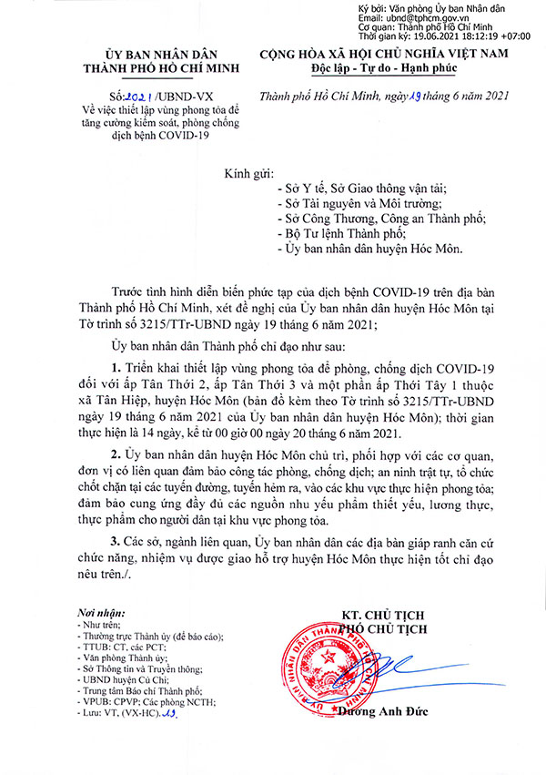 (LĐXH) – Ngày 19/6, Ủy ban nhân dân TPHCM vừa ban hành văn bản khẩn số 2021/UBND-VX về việc thiết lập vùng phong tỏa một số vùng thuộc xã Tân Hiệp, huyện Hóc Môn để tăng cường phòng, chống dịch COVID-19.