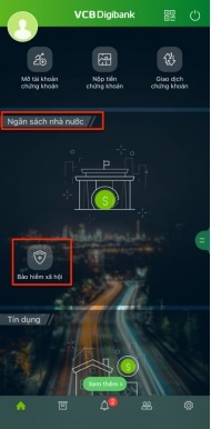 Bước 1: Đăng nhập vào ứng dụng VCB Digibank trên điện thoại. Tại màn hình chính, chọn Ngân sách nhà nước sau đó chọn Bảo hiểm xã hội.
