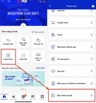 Bước 1: Đăng nhập ứng dụng MB Bank trên điện thoại, chọn chức năng Thanh toán, chọn Bảo hiểm xã hội.