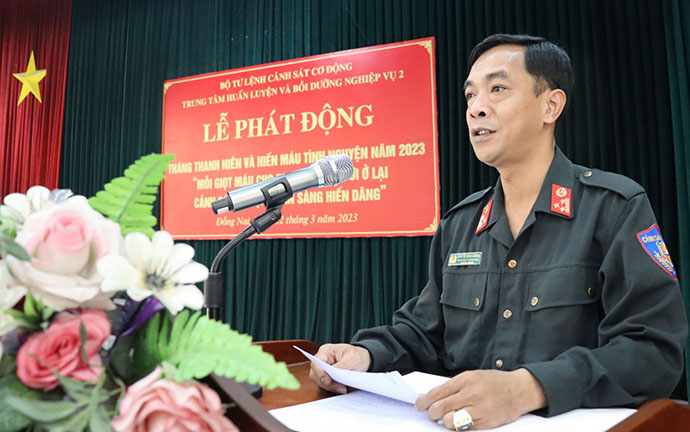 (LĐXH) - Ngày 12-3, Trung tâm Huấn luyện và bồi dưỡng nghiệp vụ 2 thuộc Bộ Tư lệnh Cảnh sát cơ động (gọi tắt là Trung tâm) đóng tại xã An Phước, huyện Long Thành, tỉnh Đồng Nai phát động tháng thanh niên và hiến máu tình nguyện năm 2023 với chủ đề: “Mỗi giọt máu cho đi, một cuộc đời ở lại, cảnh sát cơ động sẵn sàng hiến dâng”.