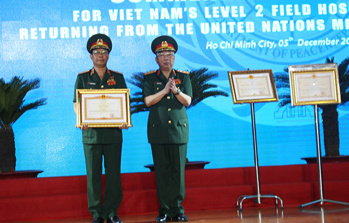 Thượng tướng Nguyễn Chí Vịnh khen thưởng Cục Gìn giữ hòa bình Liên hợp quốc trong lễ đón Bệnh viện dã chiến 2.1 hoàn thành nhiệm vụ trở về nước