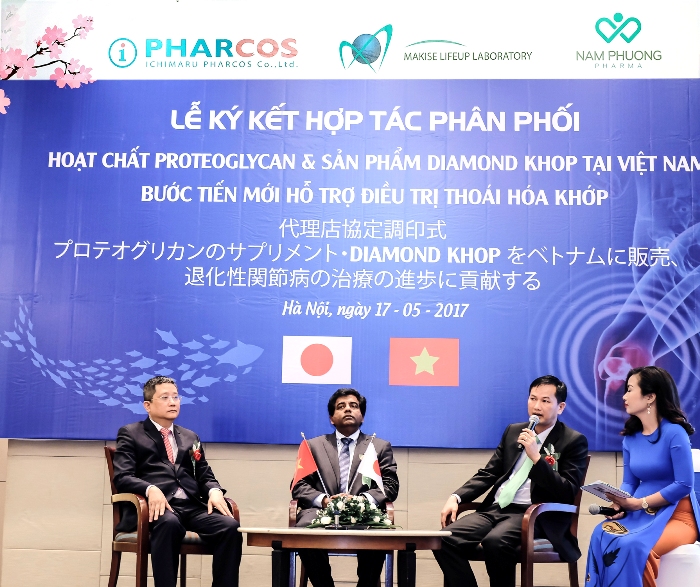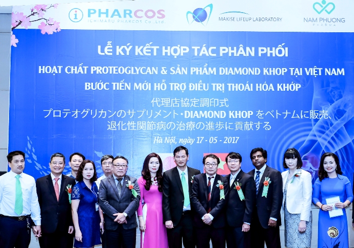 Lễ ký kết- hợp tác trong việc chuyển giao phân phối hoạt chất Proteolycan và sản phẩm Diamond khop tại Việt Nam. Tham dự Lễ ký kết có đại diện GS Tập đoàn Ichimaru; Tiến sĩ Arunasiri Iddamalgoda, đại diện Tập đoàn ICHIMARU; Đại điện Makise, Cục Vệ sinh An toàn thực phẩm; Chuyên gia xương khớp Việt Nam; Ông Nguyễn Khắc Khải, Chủ tịch Hội đồng thành viên Nam Phương Pharm; Ông Phạm Văn Dũng - Giám đốc Công ty Dược Phẩm An Đông, đại diện phân phối Diamond khop tại Phía Nam.