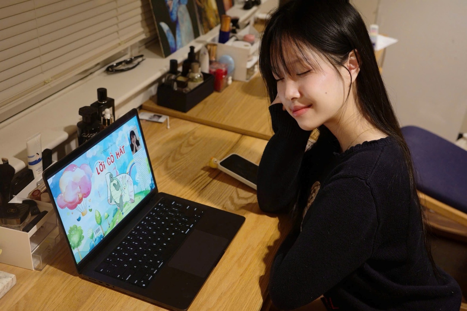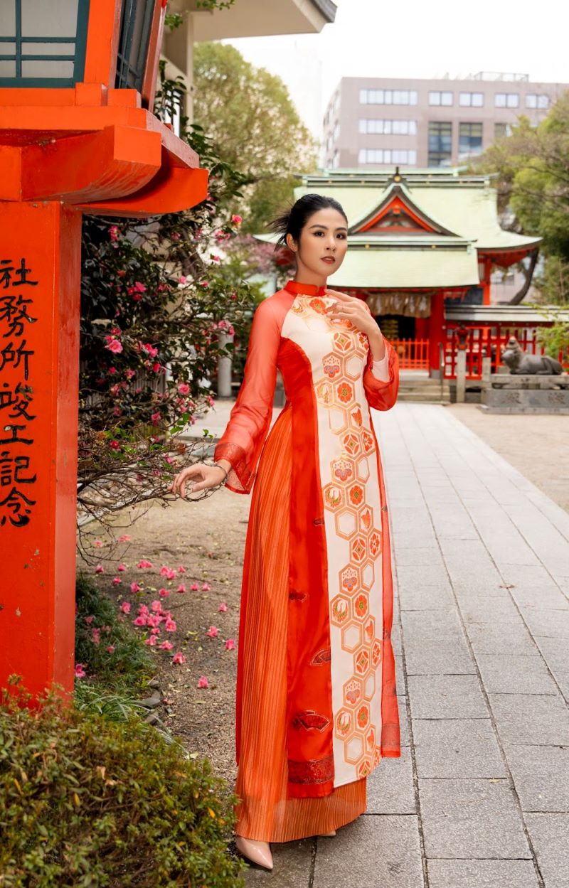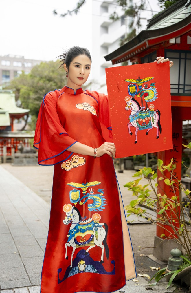 Ngọc Hân mặc áo dài thiết kế từ cảm hứng tranh Đông Hồ tại Nhật Bản