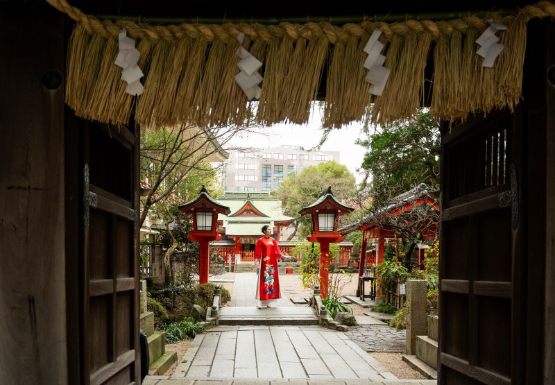 Sau 6 năm mới trở lại Nhật Bản công tác, Ngọc Hân tranh thủ thực hiện bộ ảnh kỷ niệm tại một số đền chùa nổi tiếng của Fukuoka với áo dài tự tay thiết kế.
