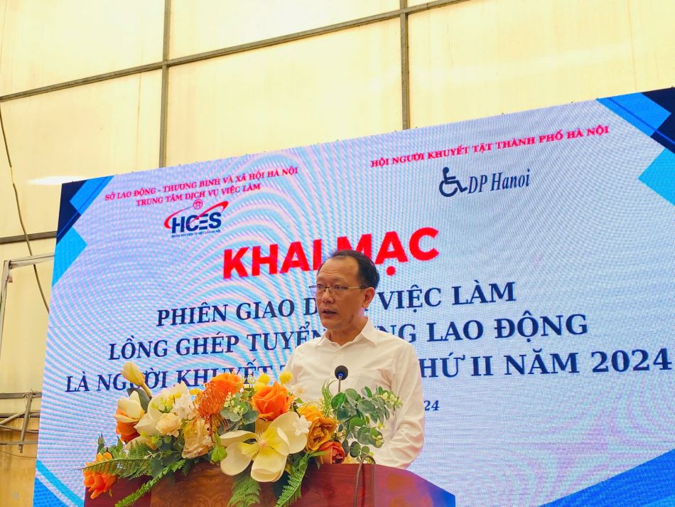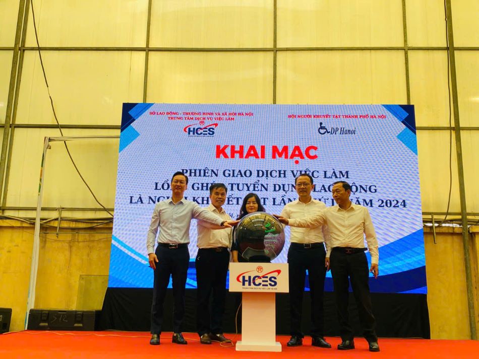Các đại biểu thực hiện nghi thức khai mạc Phiên giao dịch việc làm lồng ghép tuyển dụng lao động là người khuyết tật lần thứ II năm 2024Theo ông Thảo, trong bối cảnh kinh tế toàn cầu đầy biến động, vấn đề việc làm luôn đặt ra nhiều thách thức, đặc biệt với người khuyết tật. Hà Nội hiện có hơn 100.000 người khuyết tật, trong đó, hơn 7.000 người có khả năng lao động. Tạo việc làm cho người khuyết tật không chỉ giúp cải thiện đời sống cá nhân, mà còn góp phần phục hồi và thúc đẩy kinh tế. Việc làm sẽ giúp cộng đồng nhìn nhận người khuyết tật như những cá nhân có giá trị, có khả năng đóng góp tích cực, thay vì chỉ là nhóm yếu thế cần trợ giúp.