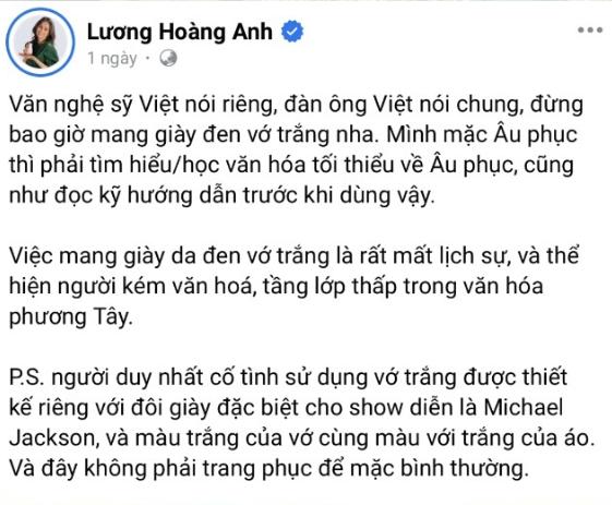 Cách kết hợp trang phục này khiến Lương Hoàng Anh không hài lòng, cô dùng ngôn từ khá gay gắt: “Văn nghệ sĩ Việt nói riêng, đàn ông Việt nói chung đừng bao giờ mang giày đen vớ trắng nha. Mình mặc Âu phục thì phải tìm hiểu, học văn hóa tối thiểu về Âu phục, cũng như đọc kỹ hướng dẫn sử dụng trước khi dùng vậy.