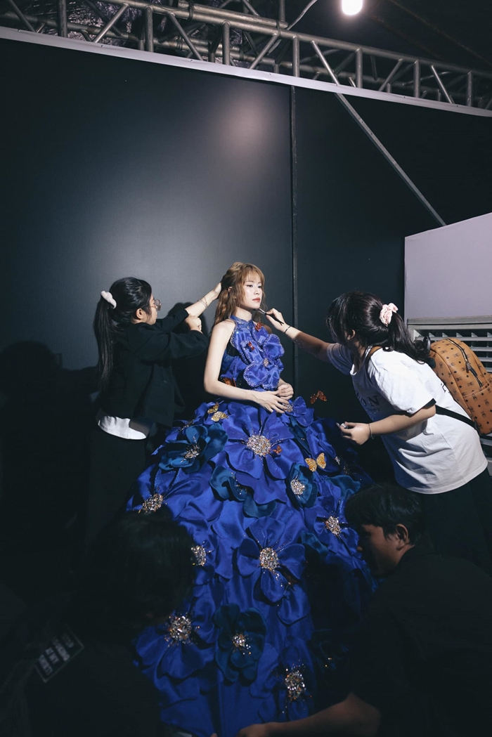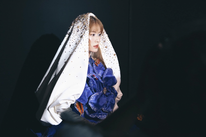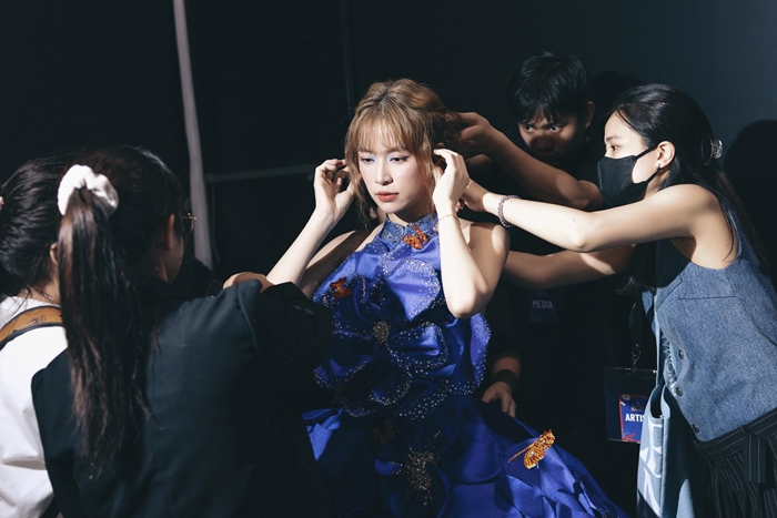 Trước khi bước ra sân khấu, ê-kíp của Hoàng Thùy Linh chăm chút khá kỹ cho tạo hình của nữ ca sĩ. Vì chiếc khăn trùm đầu đính kèm găng tay trắng, nhiều khán giả nhận định tạo hình này của Hoàng Thùy Linh giống cô dâu chuẩn bị bước vào lễ đường.