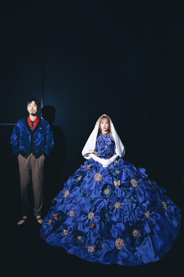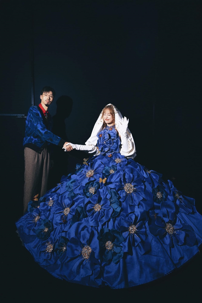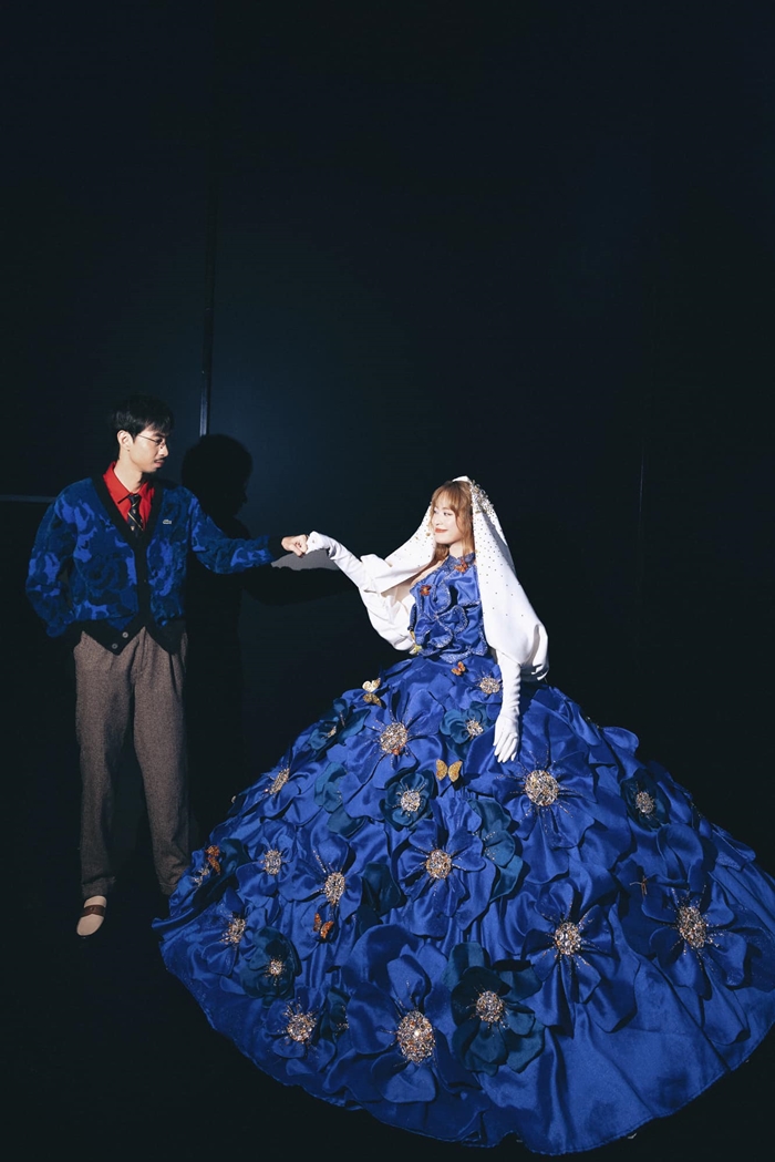 Trong loạt ảnh, Hoàng Thùy Linh diện chiếc đầm màu xanh coban được tạo điểm nhấn bằng những đóa hoa khổng lồ trên thân váy.