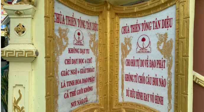 Trước cửa chùa, còn có một câu khác được ghi rõ: “Cho hỏi đạo Phật tự do dù hữu hình hay vô hình”. Điều đó cho thấy: đạo Phật không chỉ gói gọn trong những hình thức vật chất hay thế giới hữu hình. Mà Đạo Phật còn giải thích sự tồn tại rộng lớn trong không gian xung quanh chúng ta: thế giới vô hình. Tất cả những điều này, chùa Thiền Tông Tân Diệu đều giải đáp rõ ràng, rành mạch.