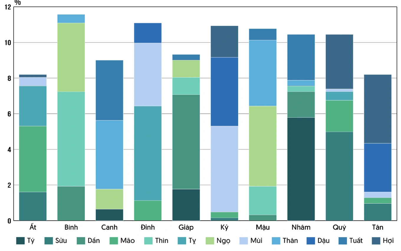 Xét theo can chi, số lượng CEO sinh năm Nhâm Tý (1972) là đông nhất, chiếm 5,8%; tiếp theo là Giáp Dần (1974), Bính Thìn (1976) và Đinh Tỵ (1977), mỗi nhóm chiếm 5,3%.