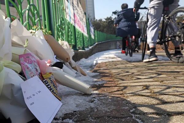 Nhiều người đặt hoa tưởng nhớ bé Kim Haneul trước cổng trường. (Ảnh: Hani)