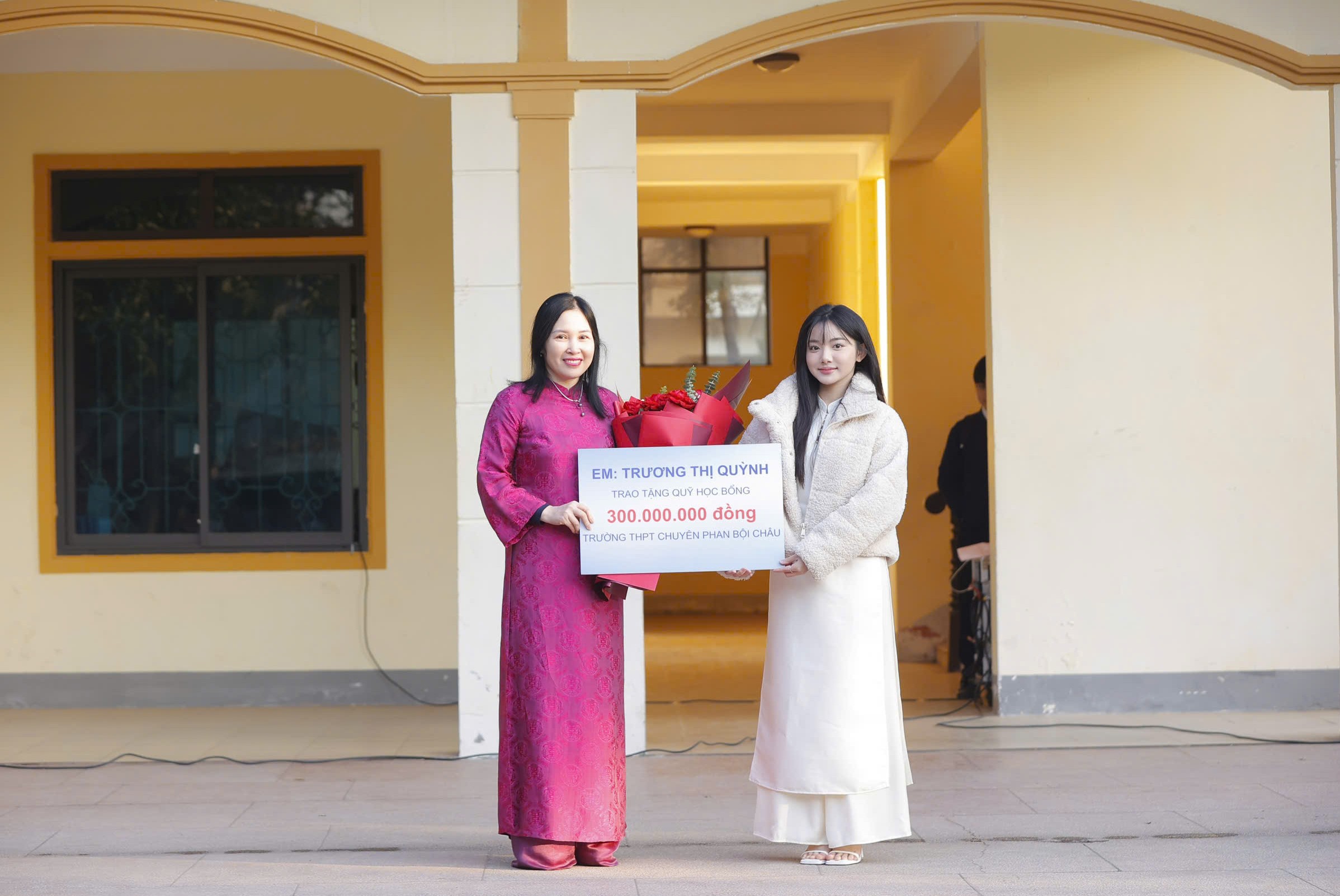 Trương Thị Quỳnh trao tặng 300 triệu đồng cho Quỹ học bổng THPT Chuyên Phan Bội ChâuQuỳnh Trương chia sẻ: “Em sinh ra và lớn lên trên mảnh đất xứ Nghệ, đầy nắng gió, khí hậu khắc nghiệt, người dân quê em luôn phải đối mặt với những thảm họa của thiên tai, bão lũ, đời sống gặp muôn vàn khó khăn, nhưng nơi đây luôn đầy ắp tình làng nghĩa xóm và sự đùm bọc giữa con người với nhau. Từ nhỏ, em đã chứng kiến xung quanh em, nhiều gia đình, bạn bè đồng trang lứa không có điều kiện học hành đầy đủ. Tuy bố mẹ em không giàu có, nhưng luôn giáo dục em về lòng bao dung, sự tử tế, và sẻ chia - “Một miếng khi đói bằng một gói khi no”. Chính những điều đó đã gieo vào lòng em một suy nghĩ: “nếu sau này em có điều kiện hơn em sẽ giúp đỡ những mảnh đời bất hạnh dù bằng cách nào đi nữa …”.