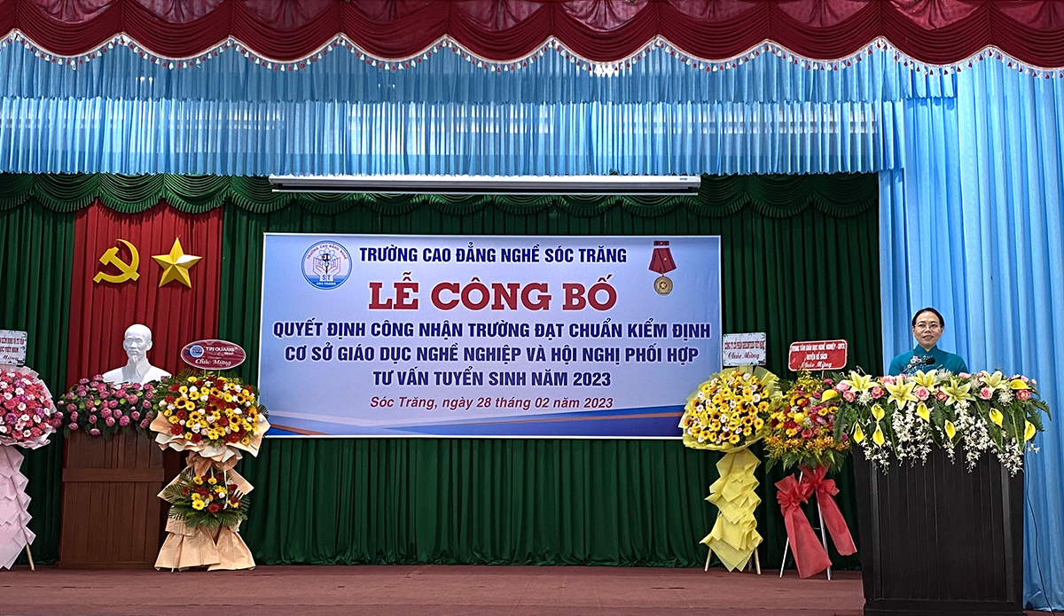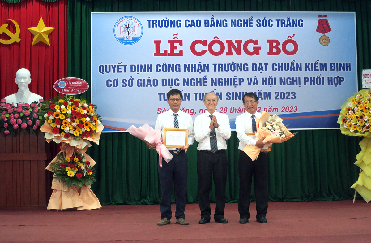 (LĐXH) - Ngày 28/2/2023, tại Trường Cao đẳng Nghề Sóc Trăng đã diễn ra Lễ công bố quyết định công nhận trường đạt chuẩn kiểm định cơ sở giáo dục nghề nghiệp và Hội nghị phối hợp tư vấn tuyển sinh năm 2023.