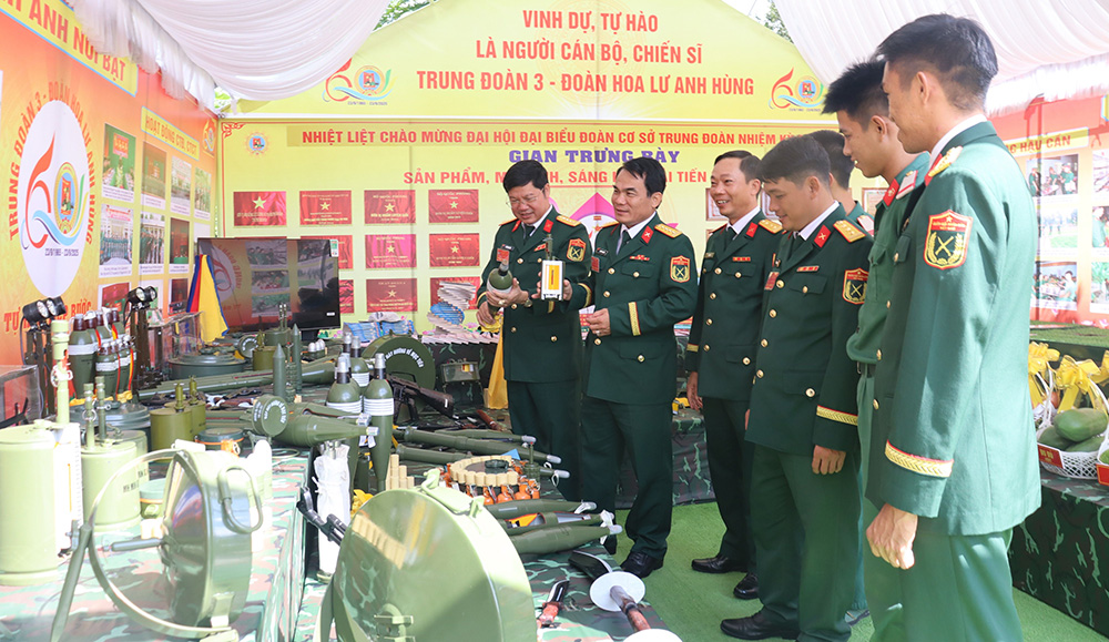 Thủ trưởng sư đoàn 9 và các đại biểu tham quan mô hình trưng bày tại đại hội