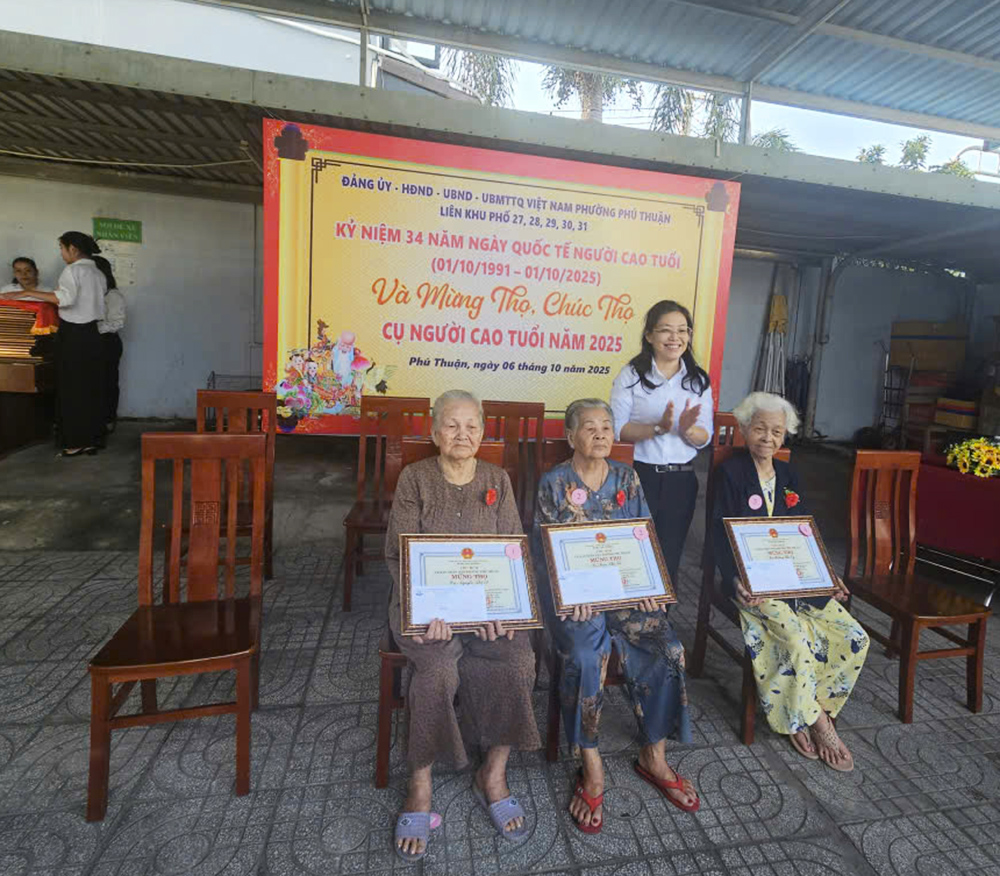 Được biết, nhân dịp Ngày Người cao tuổi Việt Nam (06/6) và Tết Nguyên đán 2025, lãnh đạo TP.HCM và phường Phú Thuận sẽ thăm hỏi, tặng quà mừng thọ cho các cụ tròn 90 và 100 tuổi tiêu biểu. UBND phường cũng sẽ tổ chức chúc thọ, mừng thọ và tặng quà cho người cao tuổi ở các mốc tuổi 70, 75, 80, 85 và 95 tuổi.