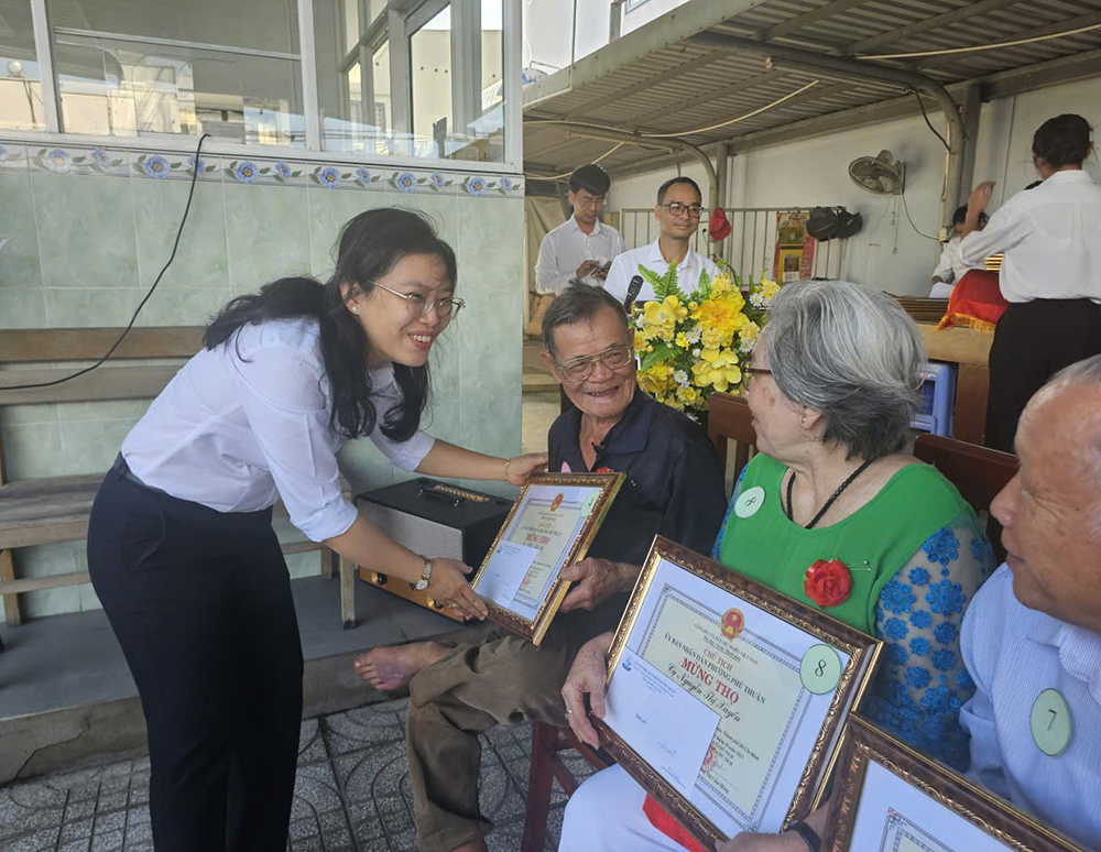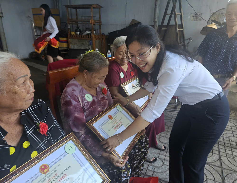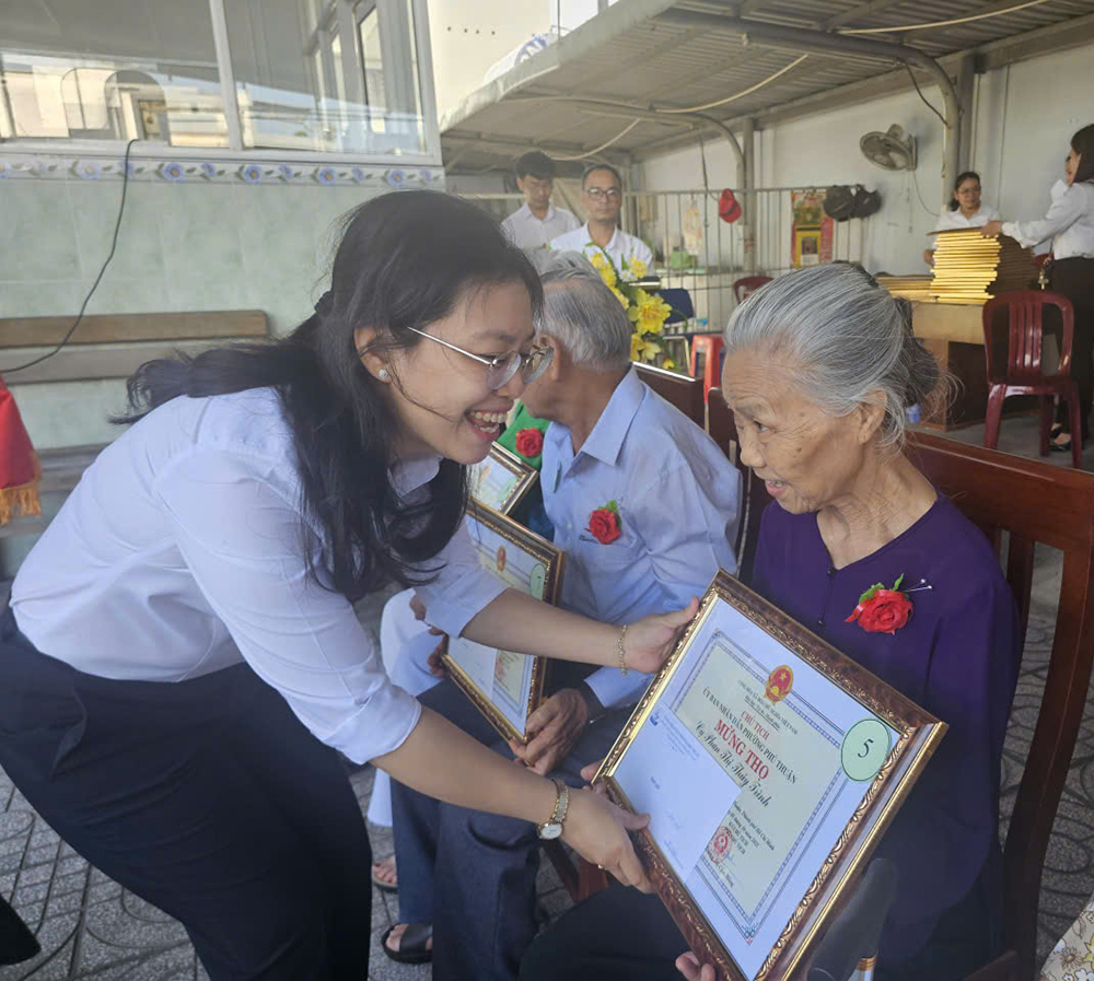 Bà Dương Thị Cẩm Hồng – Phó Chủ tịch UBND phường Phú Thuận và ông Nguyễn Quang Hùng, Bí thư chi bộ khu phó 30 phường Phú Thuận trao giấy mừng thọ và qua cho các cụ cao niên 80, thể hiện sự chăm lo cả về vật chất lẫn tinh thần, đồng thời tiếp thêm động lực để các cụ tiếp tục đóng góp cho cộng đồng.