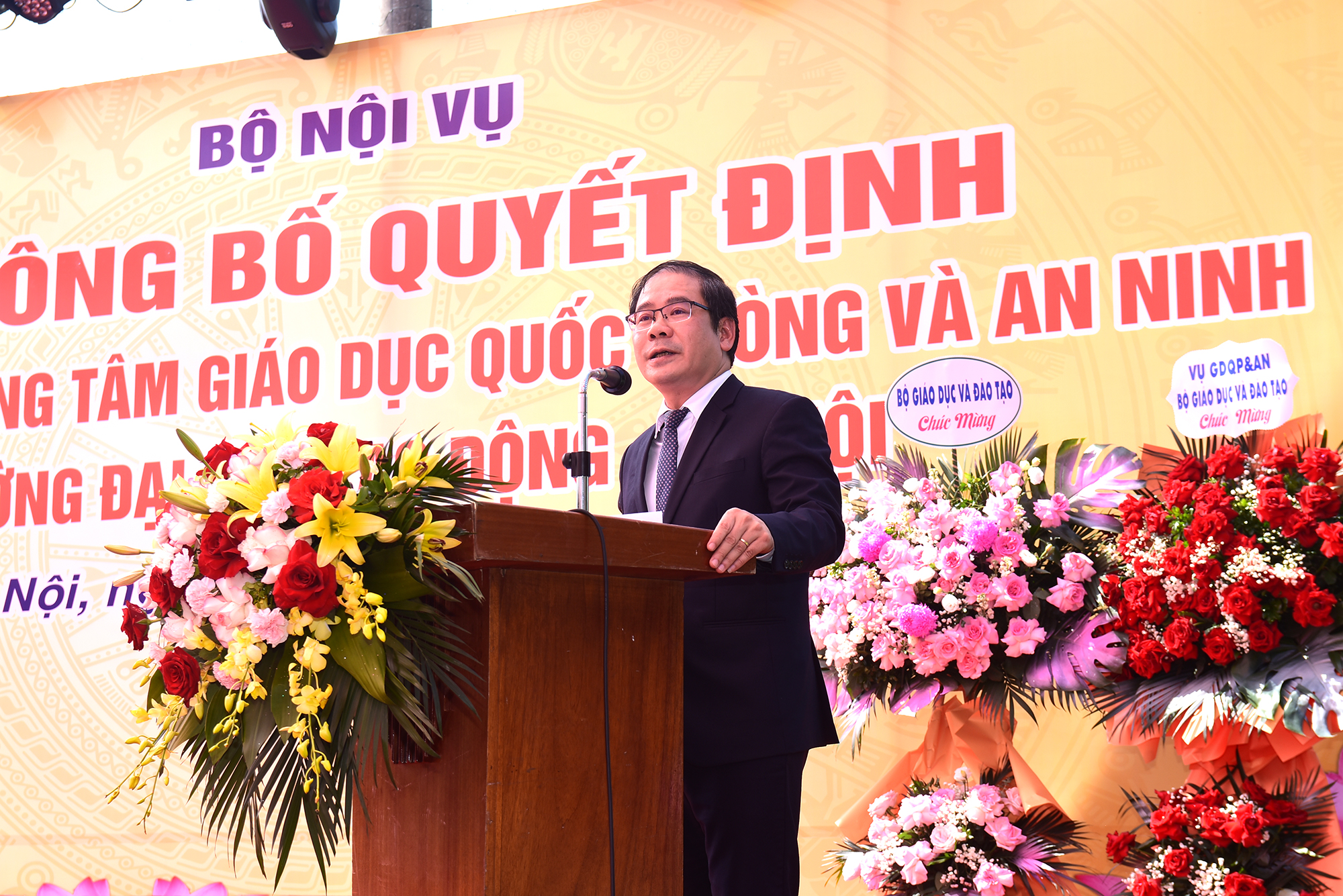 Phát biểu tại buổi lễ, đồng chí Nguyễn Huy Hưng - Phó Bí thư chuyên trách, Trưởng Ban Tuyên giáo và Dân vận Đảng ủy Bộ Nội vụ nhấn mạnh, việc thành lập Trung tâm GDQP&AN là kết quả của một quá trình phấn đấu bền bỉ, thể hiện sự quan tâm sâu sắc của Bộ Nội vụ đối với công tác giáo dục, đào tạo trong hệ thống các cơ sở giáo dục trực thuộc Bộ.