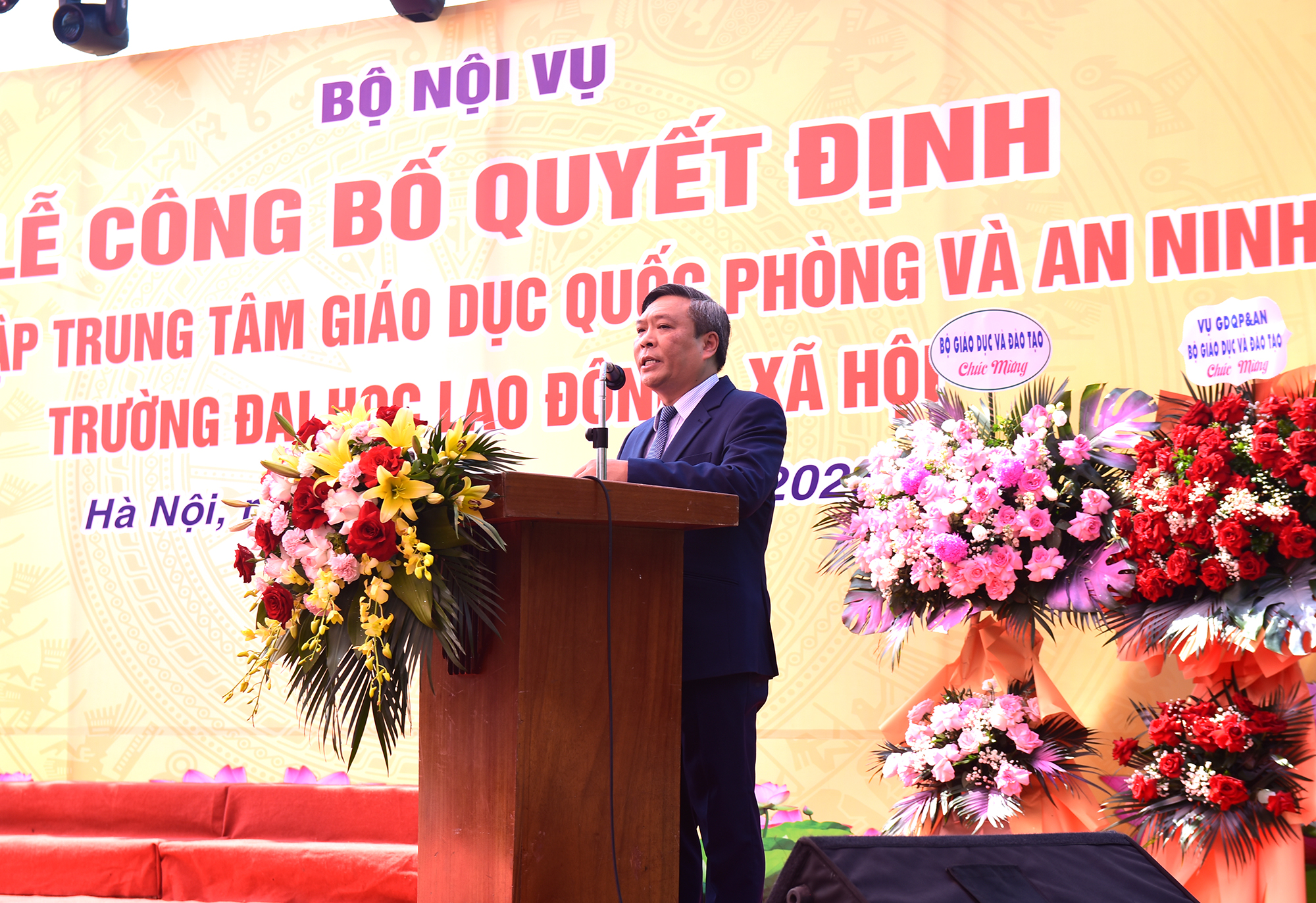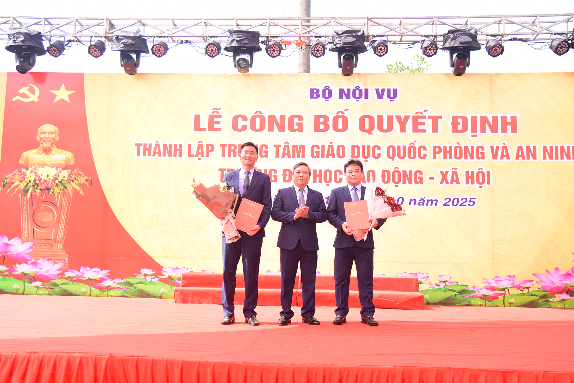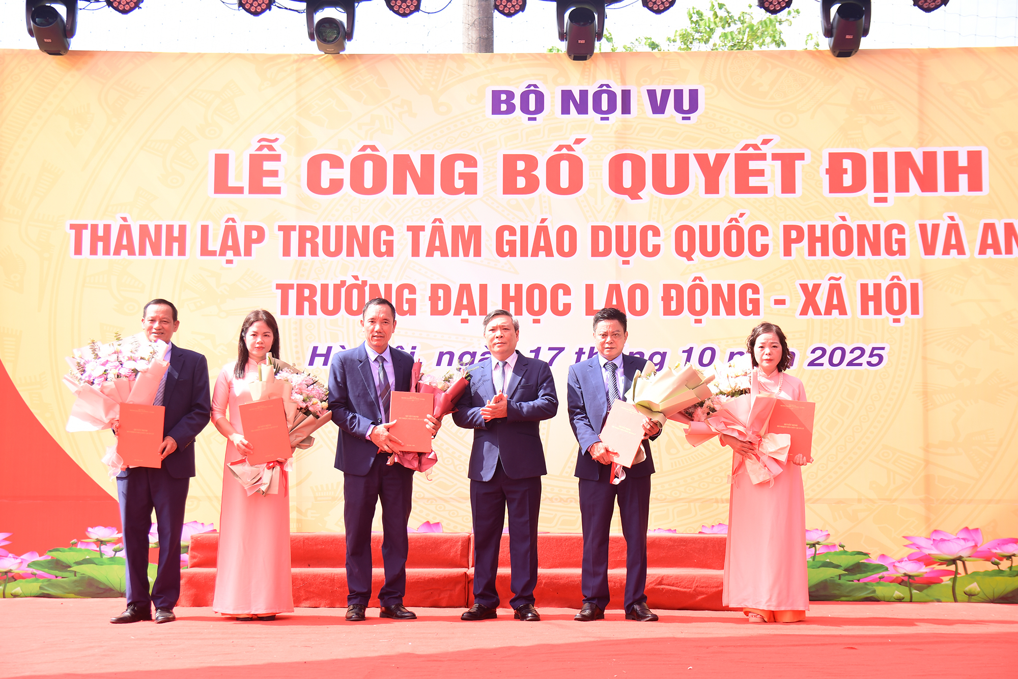 Tại buổi lễ, Ban tổ chức đã công bố Quyết định số 1091/QĐ-BGDĐT ngày 22/4/2025 của Bộ trưởng Bộ Giáo dục và Đào tạo về việc thành lập Trung tâm GDQP&AN Trường Đại học Lao động - Xã hội; Quyết định số 1003/QĐ-BNV ngày 08/9/2025 của Bộ Nội vụ quy định chức năng, nhiệm vụ, quyền hạn và cơ cấu tổ chức của trung tâm.
