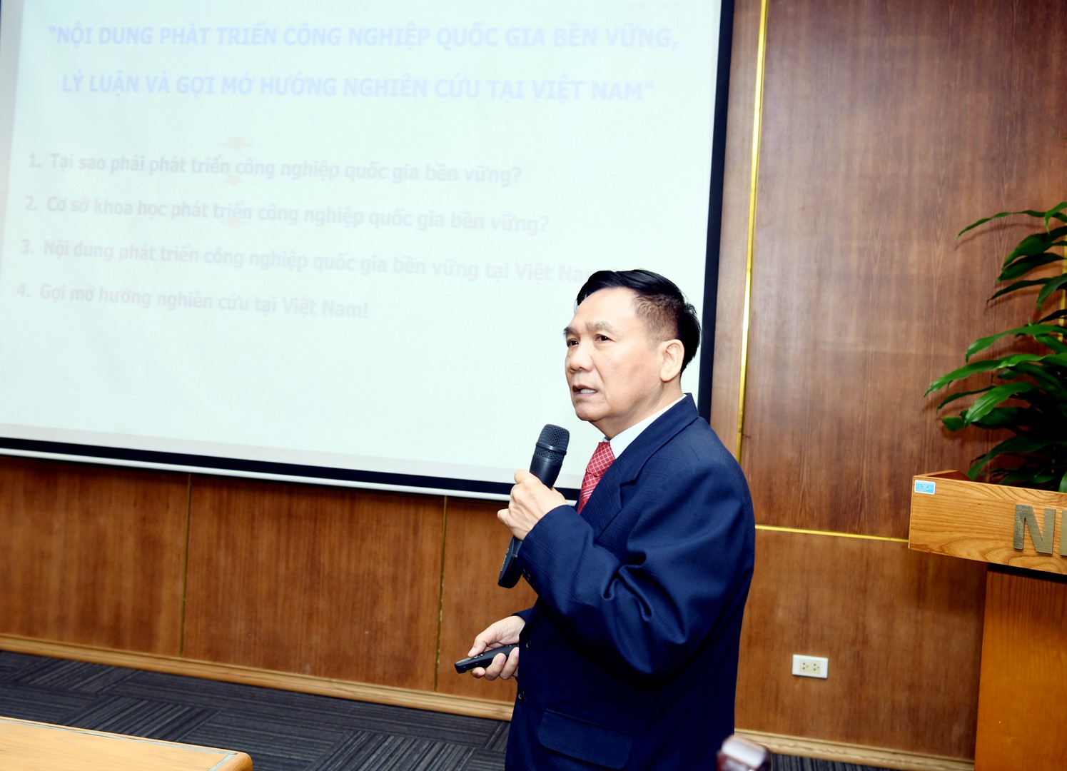 PGS.TS Nguyễn Thừa Lộc (Đại học Kinh tế Quốc dân) đã trình bày tham luận “Nội dung phát triển công nghiệp quốc gia bền vững: Lý luận và gợi mở hướng nghiên cứu tại Việt Nam”. Bài tham luận đã hệ thống hóa cơ sở lý luận về phát triển công nghiệp bền vững dựa trên cách tiếp cận ba trụ cột: kinh tế - xã hội - môi trường.