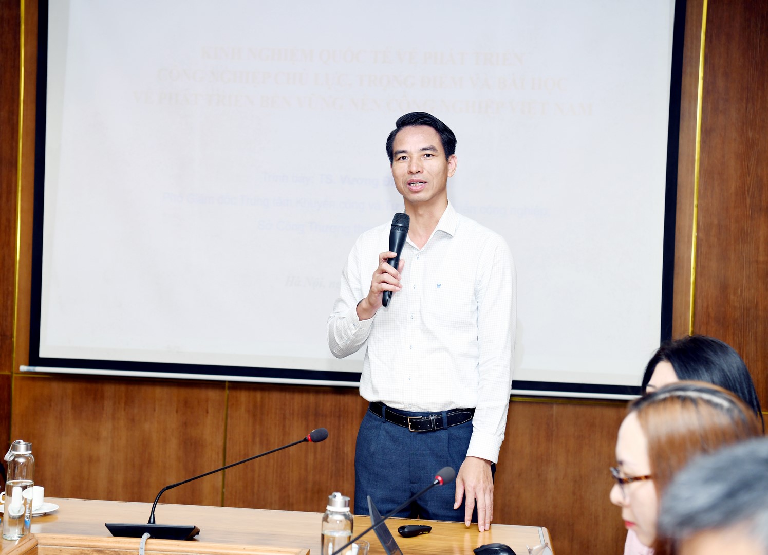Với kinh nghiệm thực tiễn phong phú, TS. Vương Đình Thanh (Phó Giám đốc Trung tâm Khuyến công và Tư vấn Phát triển Công nghiệp, Sở Công thương Hà Nội) đã chia sẻ những bài học quý báu về “Kinh nghiệm quốc tế về phát triển công nghiệp chủ lực, trọng điểm và bài học về phát triển bền vững nền công nghiệp Việt Nam”. Ông nhấn mạnh tầm quan trọng của việc xác định đúng các ngành công nghiệp chủ lực, có lợi thế cạnh tranh để tập trung nguồn lực đầu tư. Đồng thời, ông cũng chỉ ra rằng, để phát triển bền vững, Việt Nam cần chú trọng xây dựng các chính sách hỗ trợ đồng bộ, từ đào tạo nhân lực, khuyến khích R&D, đến phát triển công nghiệp phụ trợ và tạo dựng chuỗi cung ứng nội địa vững chắc.