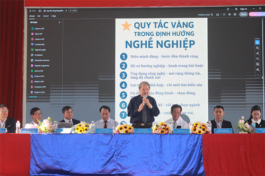 Chủ tịch Hội GDNN Thành phố, nhấn mạnh: “Buổi tư vấn hôm nay tại Trường THPT Phan Đăng Lưu là một trong những chương trình đầu tiên nằm trong định hướng đó. Chúng tôi muốn mang đến một góc nhìn mới: hướng nghiệp không chỉ là chọn nghề, mà là hiểu mình - hiểu nghề - hiểu sự vận động của xã hội, để đưa ra lựa chọn sáng suốt và bền vững. Các em học sẽ bước vào tương lai bằng chính năng lực và mong muốn của mình. “Công nghệ chỉ là công cụ giúp các em nhìn thấy con đường rõ ràng hơn”, NGƯT. ThS. Lâm Văn Quản, nhấn mạnh.