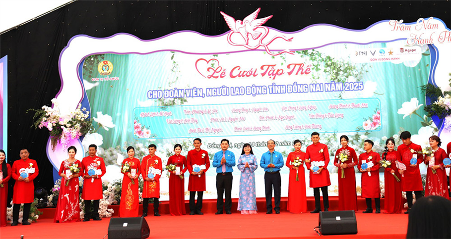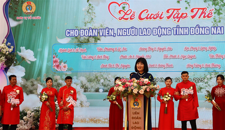 Phó Chủ tịch Liên đoàn Lao động tỉnh Đồng Nai Bùi Thị Bích Thủy cho biết: Năm 2025 là năm thứ 2 Công đoàn tỉnh tổ chức chương trình Lễ cưới tập thể cho đoàn viên, người lao động tỉnh Đồng Nai. Năm 2024 có tổng cộng 9 cặp đôi là những đoàn viên, người lao động có hoàn cảnh khó khăn chưa có điều kiện tổ chức đám cưới được Công đoàn đứng ra tổ chức. Năm 2025, con số này tăng lên 12 cặp đôi được tổ chức; trong đó có nhiều cặp đôi vì hoàn cảnh, điều kiện, họ xin phép gia đình và sống với nhau trên chục năm, đã có con lớn được tham gia lễ cưới tập thể.