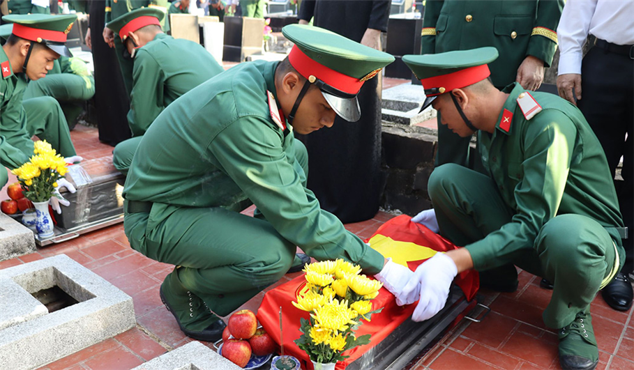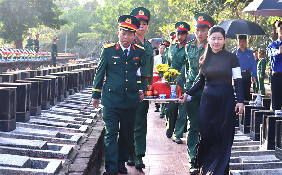 Ngay sau lễ truy điệu, đại biểu Quân khu 7, tỉnh Đồng Nai và các cơ quan, đơn vị LLVT trang trọng thực hiện nghi thức di quách, tiễn đưa 41 HCLS về lòng đất mẹ trong sự trang nghiêm, thành kính.