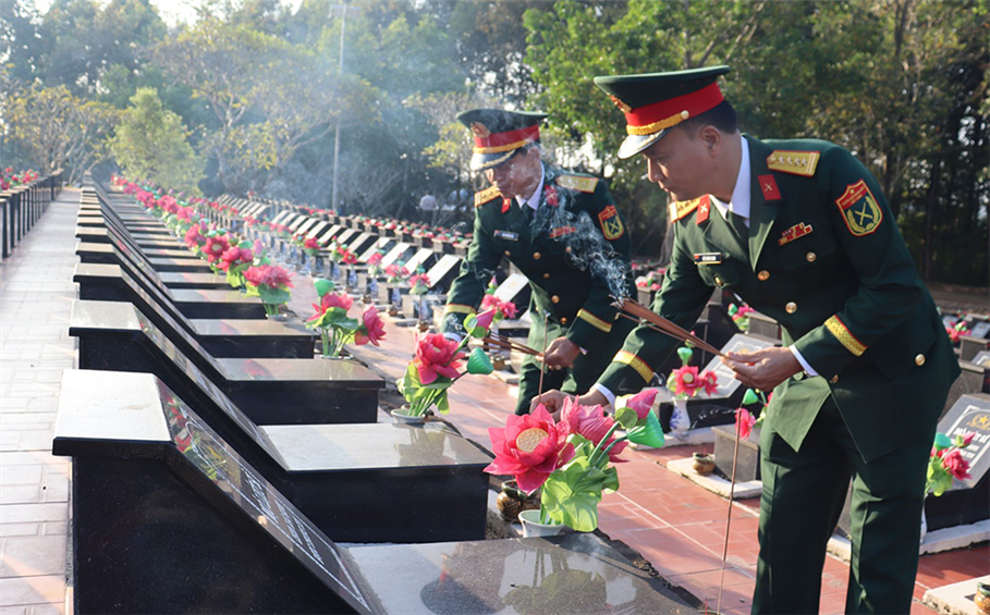 “Trước anh linh của hơn 5 ngàn liệt sĩ đang yên giấc vĩnh hằng, chúng ta - những người may mắn được sống trong hòa bình, đến đây trong nỗi niềm tiếc thương vô hạn, xin được kính cẩn nghiêng mình dâng lên các anh hùng liệt sĩ vòng hoa tươi thắm, thắp nén nhang thơm, bày tỏ lòng tri ân sâu sắc đến các anh, các chị - những anh hùng mãi mãi tuổi 20, đã mang theo những ước mơ, những hoài bão còn dang dở của tuổi trẻ, tự nguyện chiến đấu, hy sinh vì độc lập tự do cho dân tộc, vì hạnh phúc của Nhân dân. Thấm nhuần lời dạy của Chủ tịch Hồ Chí Minh “giúp Bạn là tự giúp mình”, hàng vạn cán bộ, chiến sĩ quân tình nguyện và chuyên gia Việt Nam nói chung và tỉnh Đồng Nai nói riêng, dù mới bước ra khỏi cuộc kháng chiến chống Mỹ, thống nhất đất nước, còn bộn bề khó khăn, nhưng vẫn hăng hái lên đường tham gia chiến đấu ở chiến trường Campuchia vì sự nghiệp Quốc tế cao cả trong sáng, vì độc lập tự do của mỗi dân tộc. Đất nước Campuchia được giải phóng, nhân dân Campuchia thoát khỏi họa diệt chủng nhưng nhiều đồng chí, đồng đội của ta chưa được trở về Tổ quốc. Đây là trăn trở của Đảng, Nhà nước, của nhân dân và biết bao gia đình khi phải chịu sự mất mát, tổn thất to lớn do chiến tranh không gì bù đắp được. Máu đào của các liệt sĩ đã nhuộm thắm lá cờ Tổ quốc, giành lại độc lập cho dân tộc, thống nhất cho giang sơn. Vinh quang đời đời thuộc về các anh hùng liệt sĩ”- Đồng chí Lê Trường Sơn nhấn mạnh.