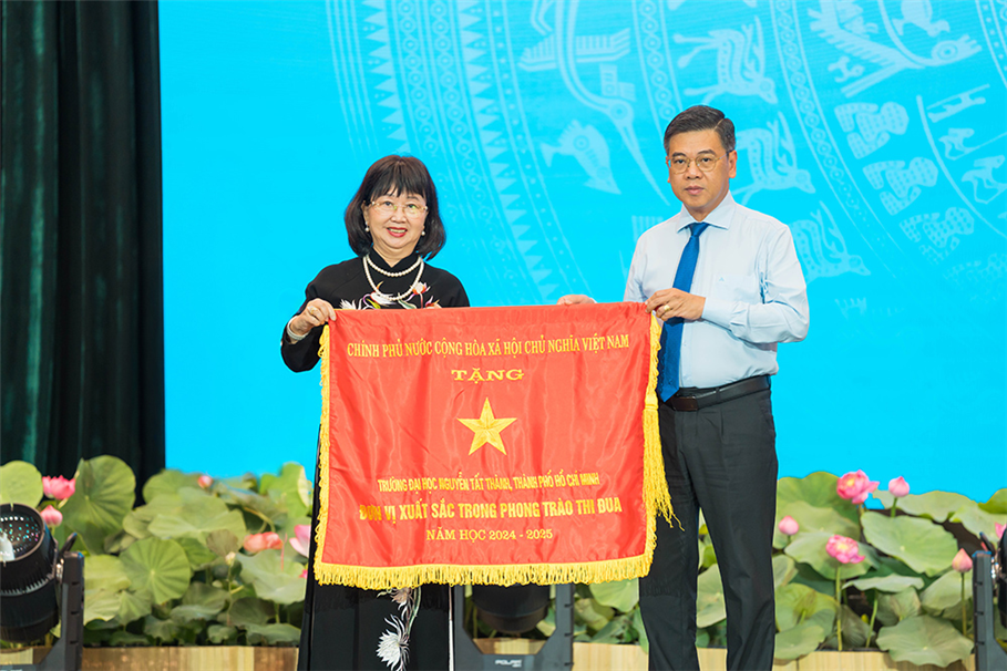 Đại diện tập thể nhà trường, TS Nguyễn Mai Lan – Bí thư Đảng ủy, Chủ tịch Hội đồng trường Trường ĐH Nguyễn Tất Thành đã đón nhận Cờ thi đua của Chính phủ vì thành tích xuất sắc trong phong trào thi đua năm học 2024–2025. Đây không chỉ là sự ghi nhận cho những nỗ lực bền bỉ của đội ngũ cán bộ, giảng viên, nhân viên và sinh viên, mà còn là động lực để nhà trường tiếp tục đổi mới, sáng tạo, đóng góp nhiều hơn cho sự nghiệp giáo dục và sự phát triển của thành phố.