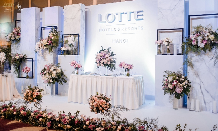 Decor của Triển lãm Cưới 2017Với những tông màu này, HWP 2018 đưa ra một không gian triển lãm cưới khác biệt và lộng lẫy, hướng tới thanh lịch và sang trọng. Mọi chi tiết ở đây đều được các chuyên gia lên phương án, tính toán hết sức tỉ mỉ, sử dụng những chất liệu hiện đại nhưng không kém phần lãng mạn như lụa, kim loại, kính và mica trong suốt, rèm ánh kim, đèn led...