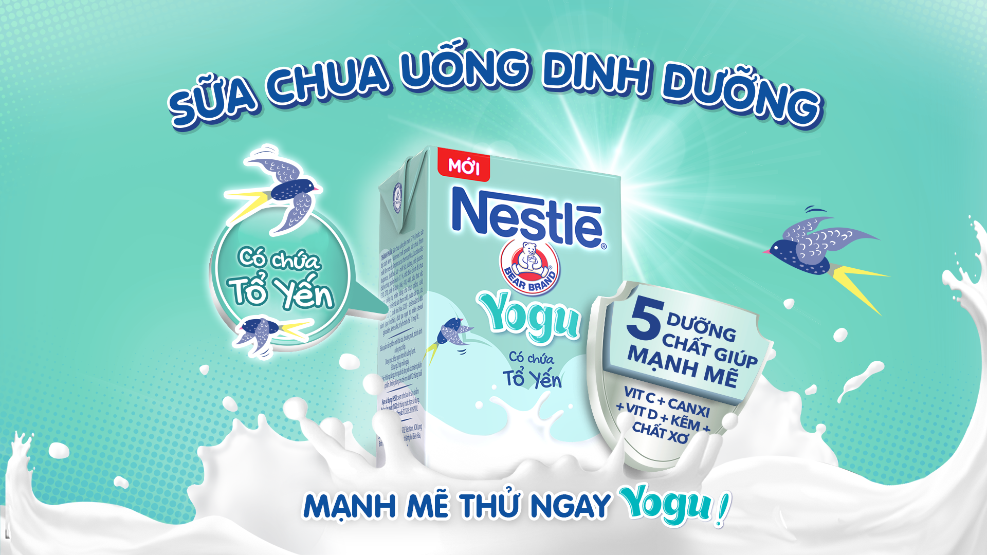 Sữa chua uống dinh dưỡng Nestlé YOGU có chứa tổ yến là sản phẩm được Nestlé Việt Nam tự hào ra mắt là thức uống dinh dưỡng cân bằng mong muốn của cả mẹ và trẻ là loại vừa có hương vị trẻ yêu thích và vừa đáp ứng được nhu cầu dinh dưỡng cân bằng cho trẻ.